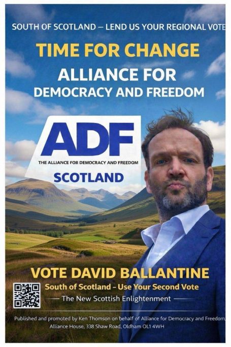 David Ballantine has been selected to stand in the Hamilton, Larkhall and Stonehouse Scottish Parliamentary elections for the Aliiance For Democracy and Freedom. David is from Stonehouse and attended Stonehouse Primary where his mother Sheila Ballantine was a teacher at Stonehouse Primary. His grandmother used to make uniforms for the nurses at Stonehouse Hospital and his Grandfather was a shop steward and textile worker at Dax Simpsons in Larkhall.